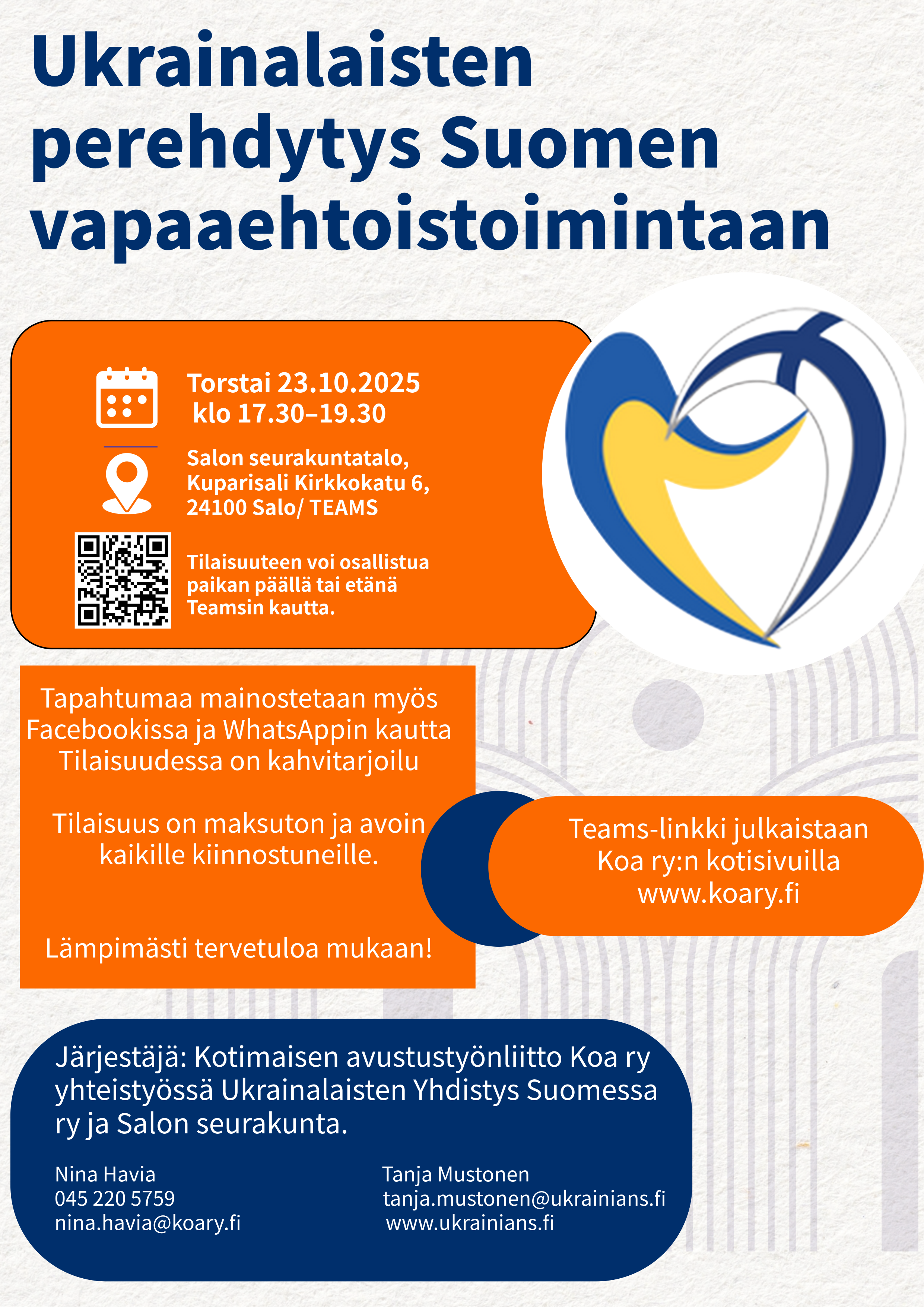 Järjestäjä: Kotimaisen avustustyönliitto Koa ry yhteistyössä UKRAINALAISTEN YHDISTYS SUOMESSA Ry ja Salon seurakunta.